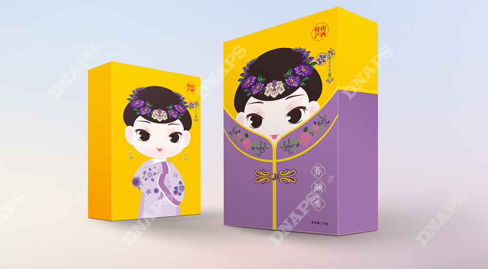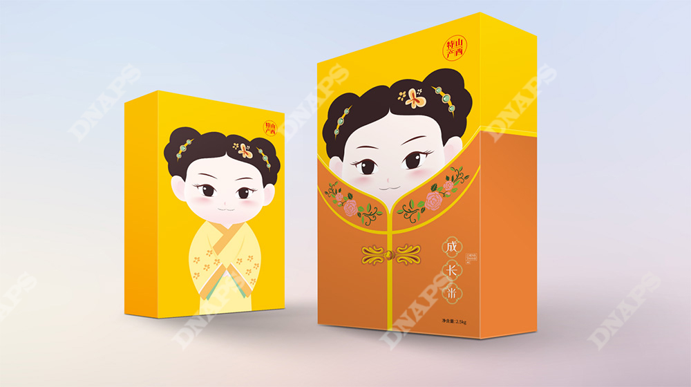 區(qū)別于傳統(tǒng)小米包裝,根據(jù)小米的不同搭配將小米分為月子米,成長(zhǎng)米,養(yǎng)顏米3類,視覺(jué)上分別以成對(duì)的嬰兒、小孩、年輕女性/媽媽為主要形象元素,采用現(xiàn)代插畫的形式創(chuàng)造三組萌趣生動(dòng)的形象,畫面生動(dòng)富有張力,配色清醒典雅,增強(qiáng)產(chǎn)品親和力。包裝盒外加設(shè)計(jì)有古典服飾圖形的封套,整體形式新穎富有層次感,拆掉封套將呈現(xiàn)另一幅畫面,開盒有趣味,讓整體形成記憶點(diǎn)。